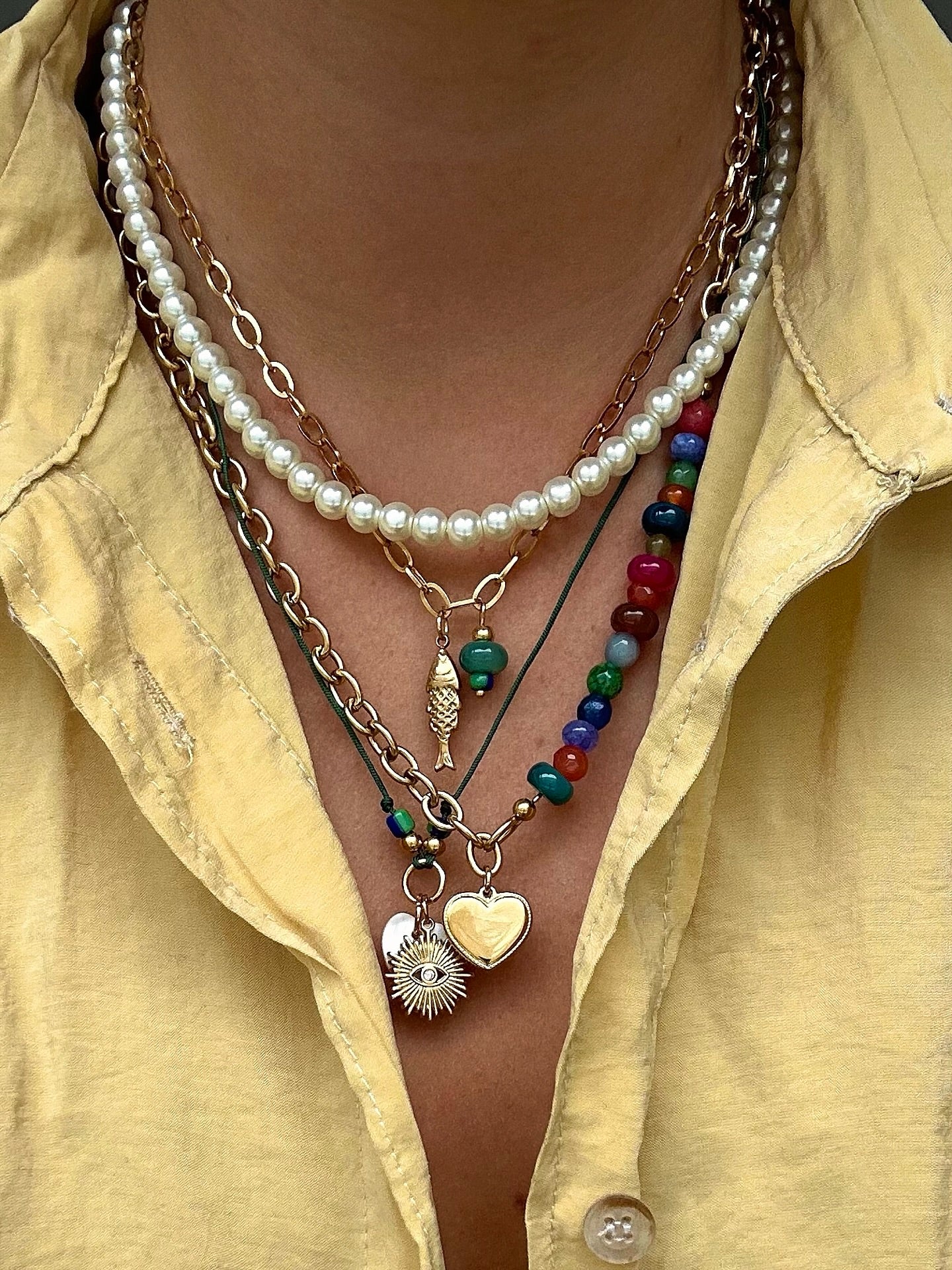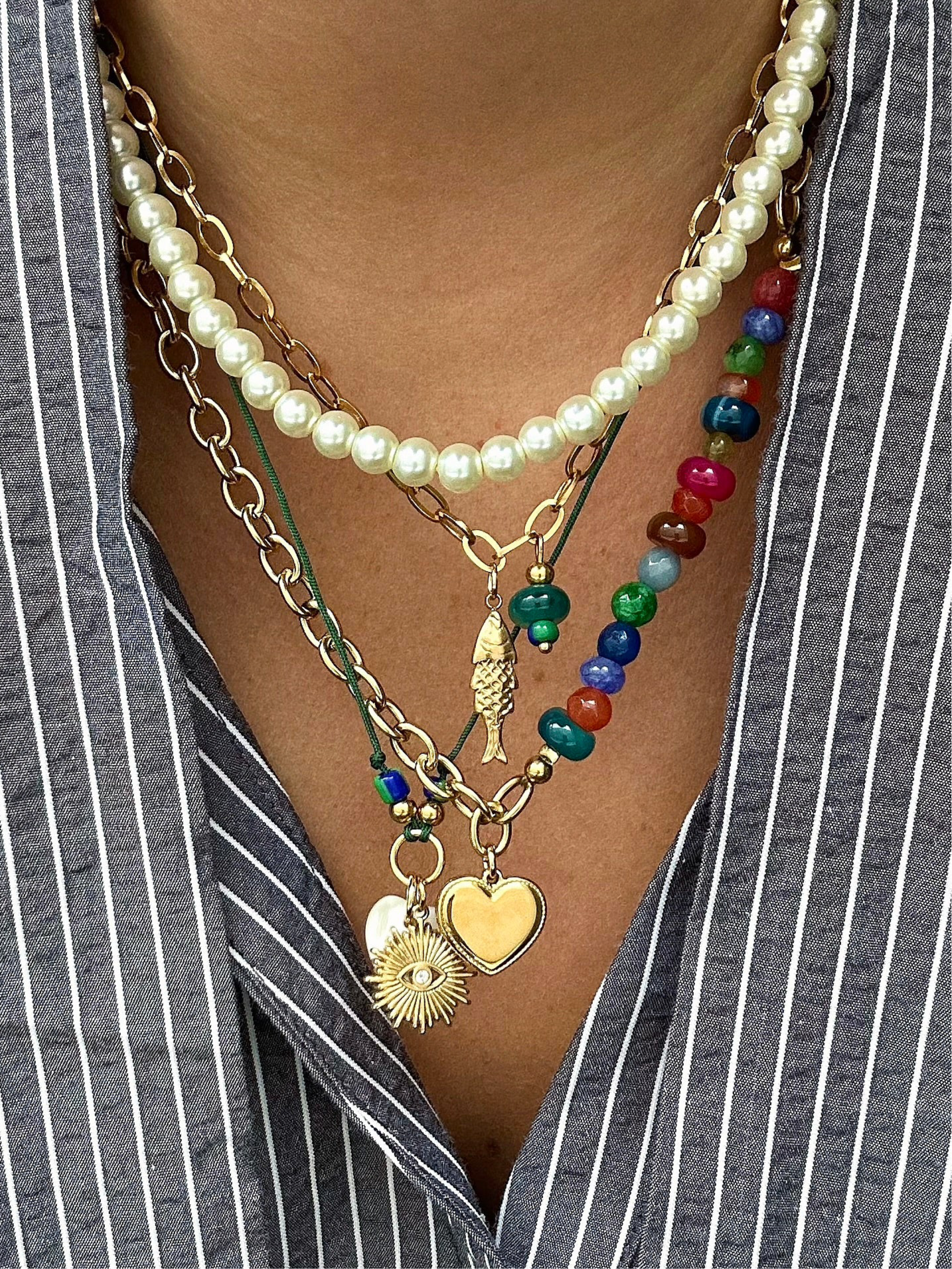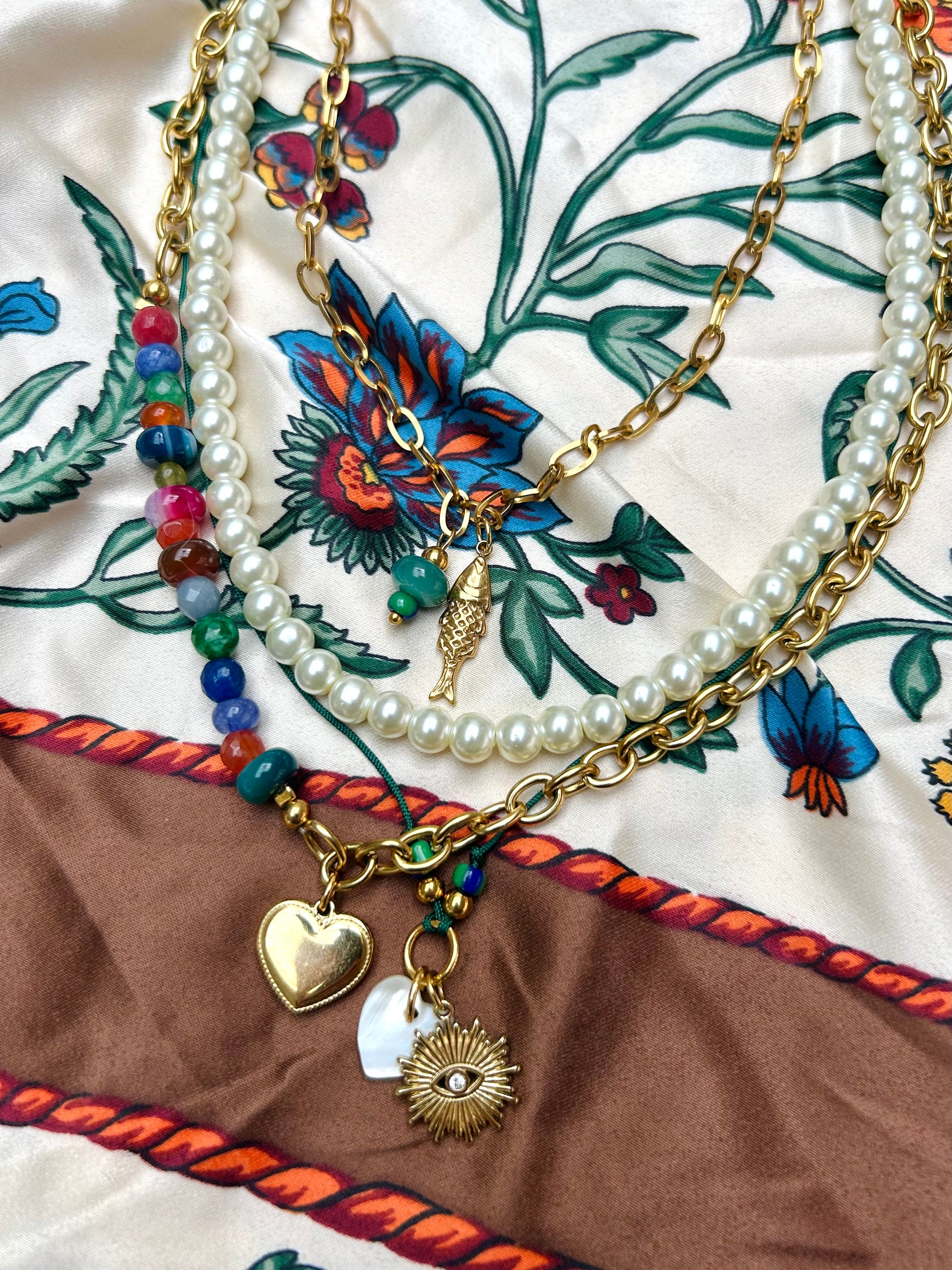 Deze set bestaat uit vier handgemaakte kettingen. Bij elkaar, óf los van elkaar te dragen! Al het materiaal is roestvrijstaal dus verkleurt niet.